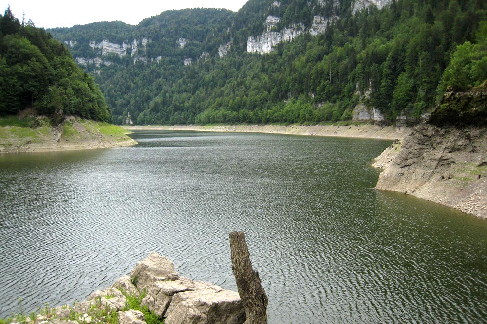 Vous pouvez alors observer, dans le Doubs, la borne historique des trois évêchés, qui marque la limite entre les possessions des évêques de Besançon, Bâle et Lausanne. Tournez à droite sur la route qui monte à l’entrée du hameau, juste avant le restaurant. Suivez les indications «Goumois» du tourisme pédestre suisse. L’itinéraire quitte la route après 600m pour emprunter un chemin de graviers qui redescend vers le lac puis remonte et pénètre dans la forêt. Rapidement, seul le murmure du Doubs vous rappelle sa présence