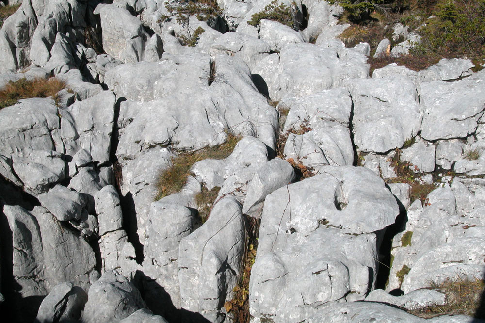 Les calcaires se sont formés au fond des mers tropicales au fil d’une longue sédimentation de squelettes d’animaux marins (coquillages, coraux...). Par le biais de l’insidieux mouvement des continents, ces roches ont peu à peu migré vers nos régions tempérées, avant de se plisser lors de la formation des Alpes. C’est pour cette raison que l’on peut trouver des fossiles de coquillages même dans ces montagnes.