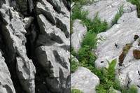 Contrairement aux autres lapiés croisés jusqu’ici, ceux situés au pied des arbres présentent des arêtes tranchantes. Cette particularité est due à leur milieu de formation. A l’air libre, la dissolution résulte uniquement du ruissellement de l’eau de pluie. Ce ruissellement tend à approfondir les sillons formés à l’air libre qui à terme seront séparés par des arêtes acérées.